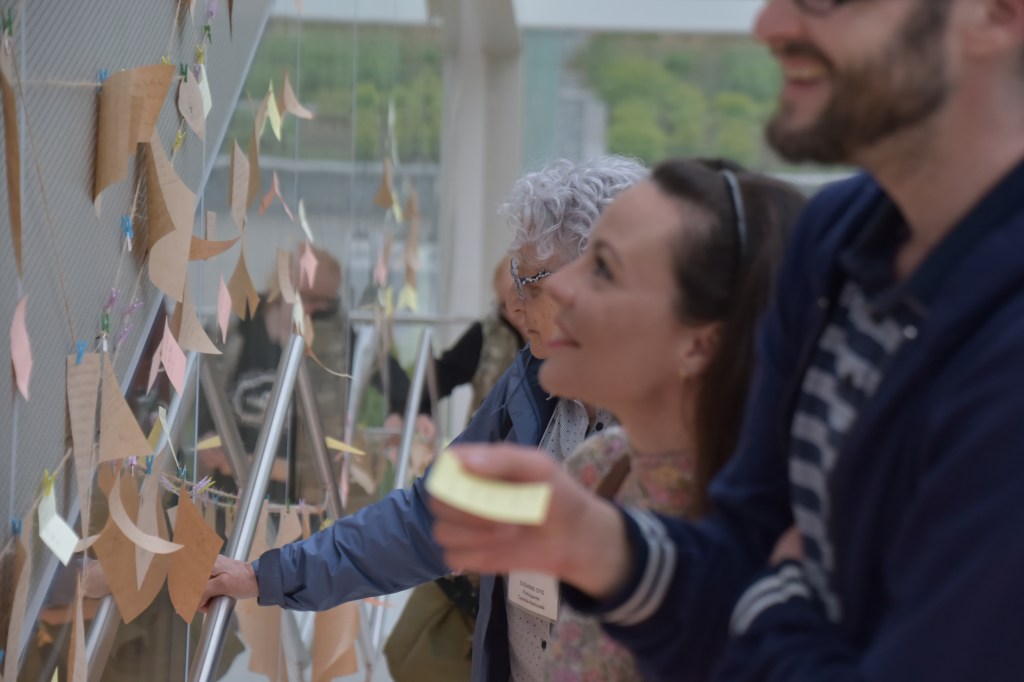 Les souhaits recueillis de façon numérique, retranscrits à l’aide de crayons bios sur du papier compostable, ont été exposés au Musée national des beaux-arts du Québec (MNBAQ) le 16 mai 2022 en soirée. Dans l’espace vitré des « escaliers suspendus », les deux cents personnes présentes ont gravi l’installation immersive où elles étaient enveloppées de souhaits murmurés et de musique douce composée par Olivier Amyot-Ladouceur. Chaque participant.e, invité.e à cueillir le rêve de son choix, a ensuite ajouté le sien à l’endos. Au terme du parcours, des graines de fleurs sauvages et de fines herbes étaient remises, afin d’enfouir souhaits et graines en terre, à l’endroit de son choix, pour faire fleurir un espace où le rêve peut grandir.